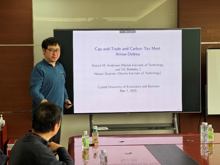 3月7日,端木昊随教授以《当限额交易遇上碳税:基于阿罗-德布鲁框架的研究》(《Cap-and-trade and Carbon Tax Meet Arrow-Debreu》)为题做学术报告。报告重点讲述构建配额均衡与碳税均衡两种一般均衡模型,证明在政府设定排放总量目标或税率后,两种机制均可实现帕累托最优,但存在均衡多重性:单一配额可能对应不同均衡价格,单一税率可能引致不同排放水平,导致两种机制的非完全等效性。