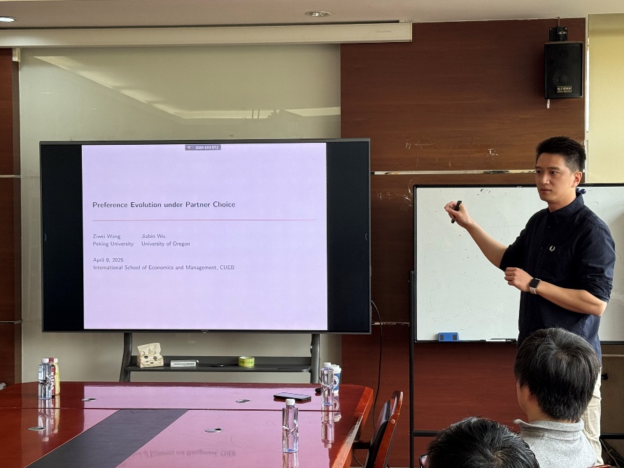 4月9日,王子伟老师为日本成人电影 师生作了题为《配对选择中的偏好进化》(《Preference Evolution under Partner Choice》)的学术报告。报告研究了内生匹配下的偏好演化:短期中个体主观偏好影响社交互动中的伴侣选择与行为,进而决定物质收益并驱动长期偏好进化。分析表明,内生匹配会进化出兼具亲缘偏见与高效合作能力的稳定偏好,这些偏好通过促成同类匹配与联合收益最大化占据优势;而在信息不完全时,狭隘主义等强亲缘偏见能通过强化自我分类动机成为演化稳定的关键。